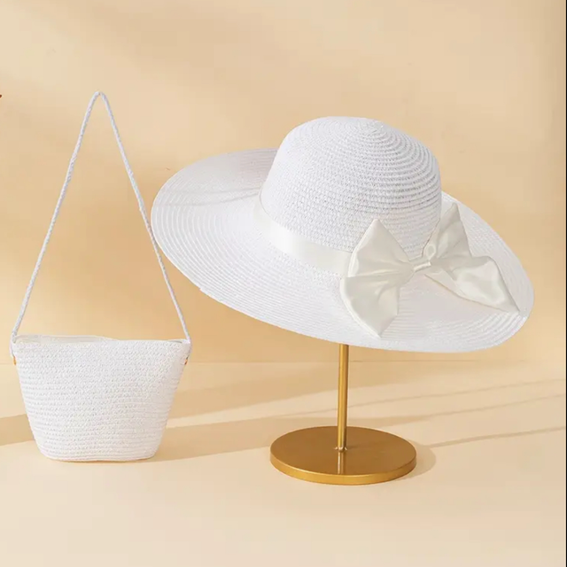 Ensemble chapeau en paille et mini sac assorti, orné d’un joli nœud papillon. Un choix élégant et estival, parfait pour les mariages, les vacances à la plage ou les sorties d’été.