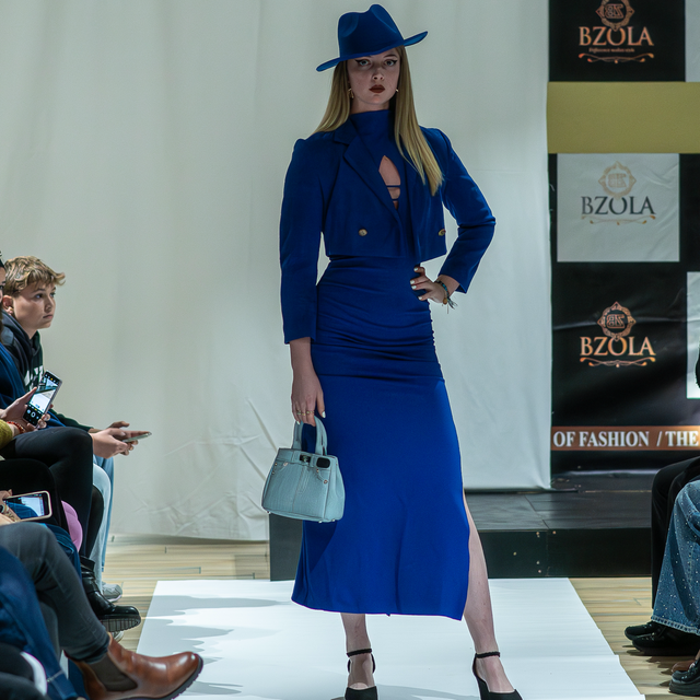 Une élégante robe longue à col montant et fendu, fusion parfaite de sophistication et de séduction. Sans manches, Unicolore bleu Avec fente & décolleté au centre. *Collection bzola conçue en Édition Limitée*
