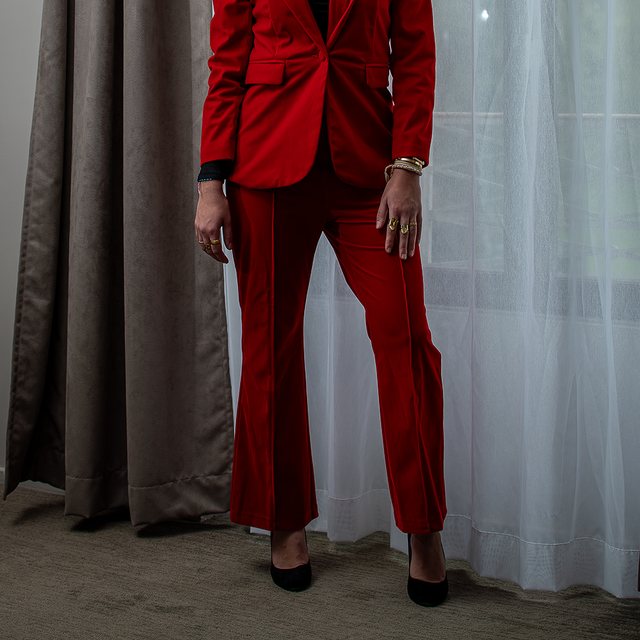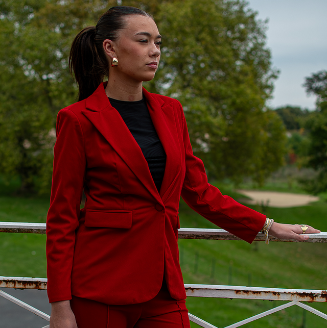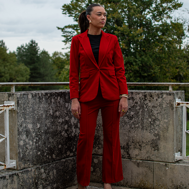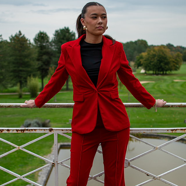 Un ensemble audacieux et raffiné pour celles qui aiment se distinguer. Le blazer boutonné et le pantalon assorti offrent une allure élégante et affirmée. Parfait pour les événements formels ou les occasions spéciales, ce costume se porte avec assurance en toute saison. Le modèle porte une taille S.